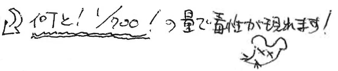 さて、毒性という点で、食品添加物と農薬を比較すると、一般に農薬に用いられる化学物質の方が極めて強い毒性を持つようです。例えば、保存料として使用されるソルビン酸は、動物に0.37μg/kg体重/日を投与した時にはじめて有害な影響が現れますが、除草剤として使用されているアラクロールは、たった0.0005μg/kg体重/日で毒性が現れるのです。実にソルビン酸の約700分の1の量です。