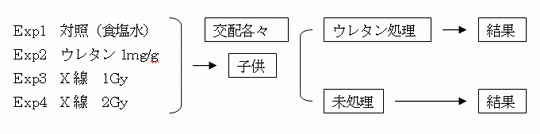 CBAマウスでの、受精前の精子へのX線照射とウレタン曝露が末処理の子孫の発ガン率を増加させるか、又、その後の発ガン促進作用を持つ薬剤曝露が発ガン感受性を高めるかを生涯にわたって追跡した。 ![]() 各処理後、1,3,9週後に未処理メスと交配 X線を被曝して1週後に交配したオスから子供の内、メスは対照に比べて造血器官のガンが増加していた。 |