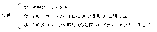 数多くの研究が電磁場が細胞に影響を及ぼすことを示してきた。この研究の目的は、900メガヘルツの携帯電話によって起こされる、活性酸素の生成による酸化的ストレスとビタミンEとCによる予防効果を、ラットを用い、電磁場によって引き起こされる、子宮内膜の傷害と細胞死で調べた。 解説