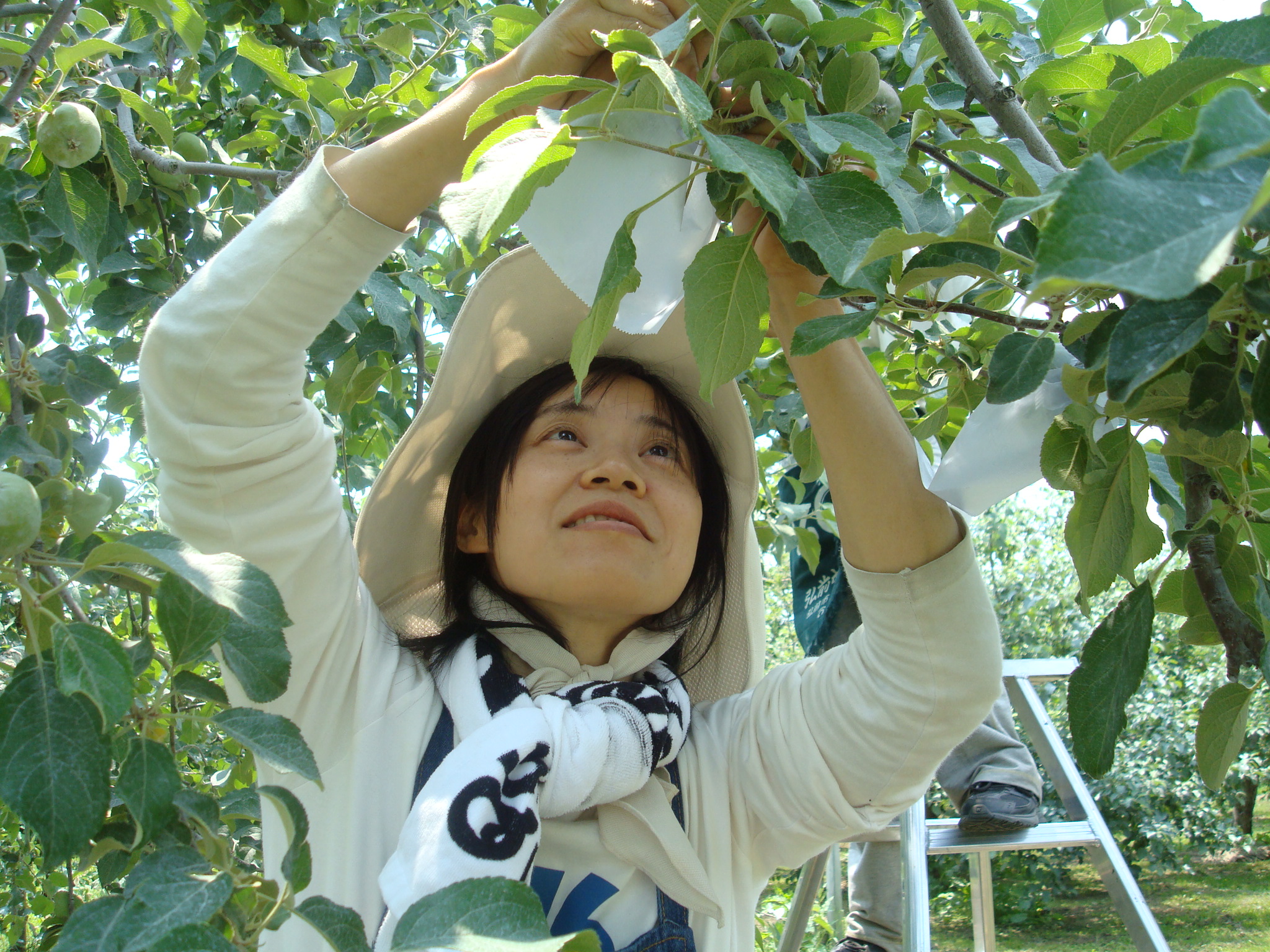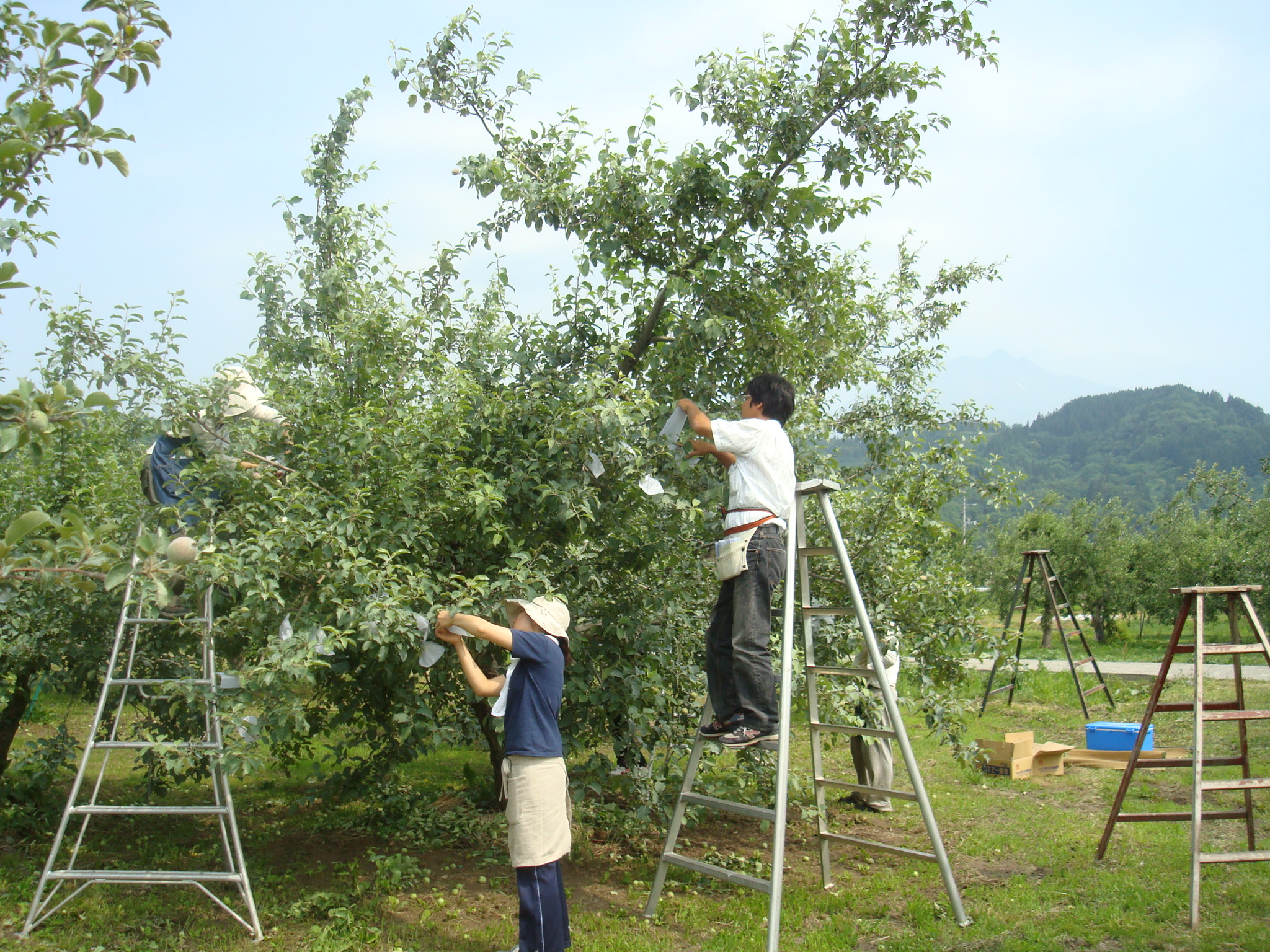 初めは実が枝から取れてしまいそうで、おっかなびっくりでした。 三上さんは体格もよく手も大きい。でもするすると脚立を昇り次々と袋を掛けていきます。 永年この木たちと生きてきたんだなぁ・・・、職人だなぁ・・・と思いました。 一つ一つ掛けるのは大変なことで、もう全部掛けたかな?と思っても反対側から見るとまだ残っていたり、葉っぱの裏側に隠れていたり、同じ緑色だから見つけるのが難しかったです。 帰る頃には、もう一枚、もう一枚、一個でも多く!とみんな懸命になっていました。(約6000枚掛けました) でも掛けてない木がまだまだあって、もう少し手伝いたいと思いました。 その後、三上さん家族三人でやってくださり、全部で13000枚になりました。 |